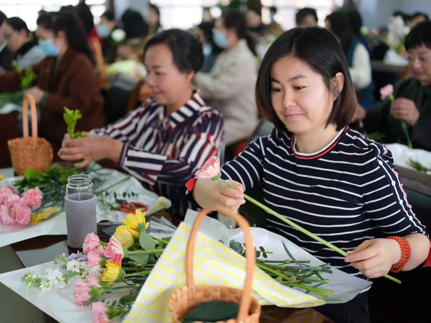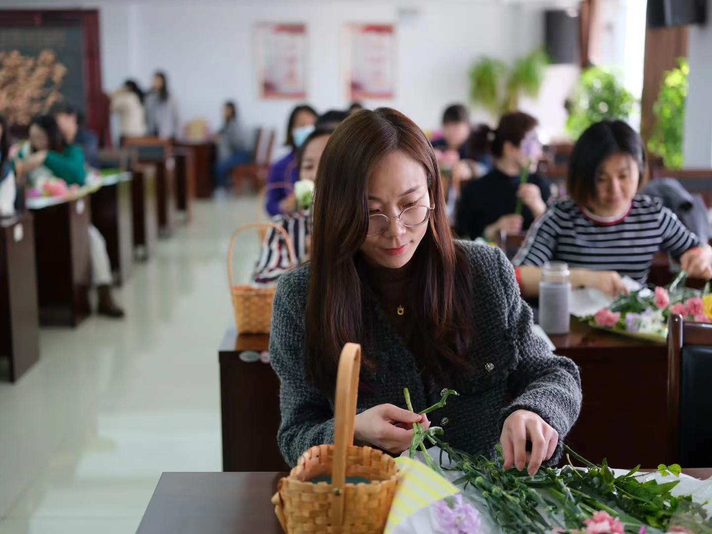 活动现场大家热情高涨,工会精心准备了康乃馨、百合、玫瑰等鲜花,并邀请了专业插花老师进行现场指导,由易到难,由浅入深,指导大家如何选材和颜色搭配,并对如何错落有致地插花等方面进行了细致讲解。大家一边听从老师指挥,一边发挥创造力和想象力,现场气氛活跃,心与花交融,情与美互通。大家用慧思巧手制作出独具魅力的插花作品,会场瞬间变成了花海艺术的殿堂。