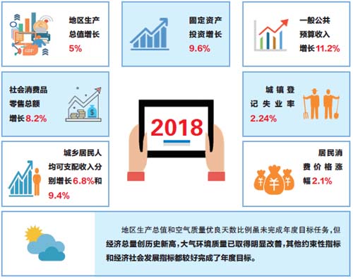 深入开展大气、水、土壤污染防治“三大战役”。完成“煤改电”、“煤改气”和集中供热等清洁能源替代63691户,全市空气质量优良天数比例达到64.4%,优良天数较2017年增加13天。中央生态环境保护“回头看”交办案件全部办结。关停取缔“散乱污”企业109家,万元地区生产总值能耗下降3.4%。